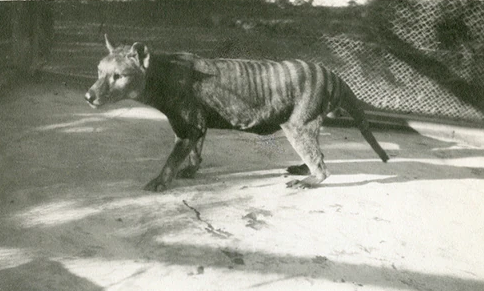 The thylacine, Thylacinus cynocephalus, Tasmanian wolf. Call it what you will but this stripy, mursupial-pouched dog was native to the Australian mainland and the islands of Tasmania and New Guinea before being hunted to extinction. The last known Tasmanian tiger was in the Beaumaris Zoo in Tasmania, eventually passing away in 1936.